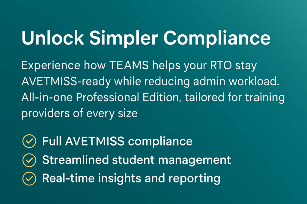 Discover how TEAMS can simplify compliance, reduce admin time, and give you a complete all-in-one system purpose-built for Australian RTOs